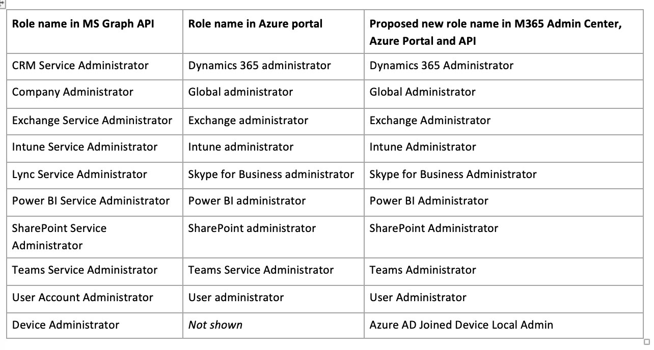 In figura i ruoli di Azure Active Directory che sono stati ridenominati. Queste sono le nuove diciture che compaiono su: