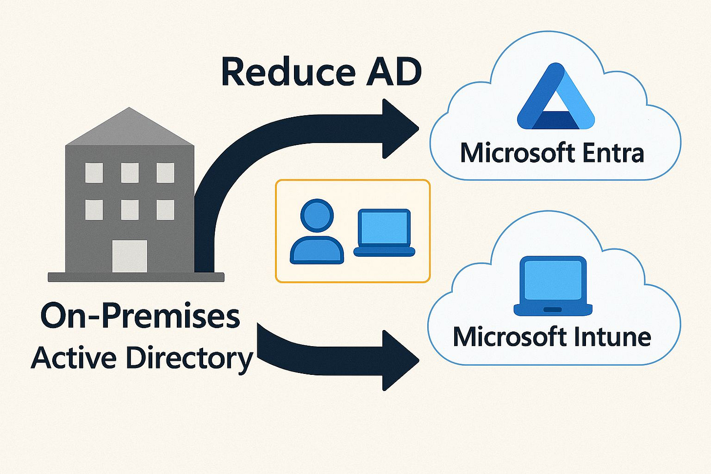 Reducing Dependence on On-Prem Active Directory doesn’t have to mean “Full Cloud or Nothing”. It’s more useful to think in terms of AD minimization: gradually moving identities and device management to cloud platforms (Microsoft Entra + Intune) where it makes sense, while keeping on-prem only where it’s truly needed.