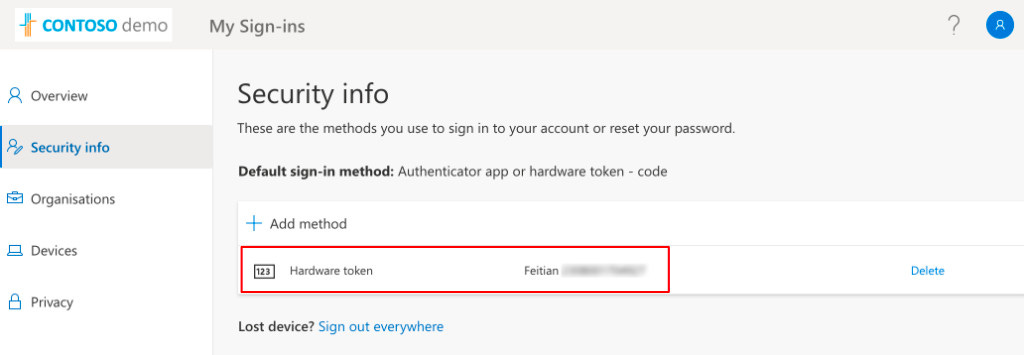 Piccola curiosità: accedendo al pannello di controllo del proprio account M365, alla sezione “Security Info” (https://mysignins.microsoft.com/security-info), il token è già censito come metodo di verifica, senza che l’utente abbia dovuto fare nulla. Comodo, vero?