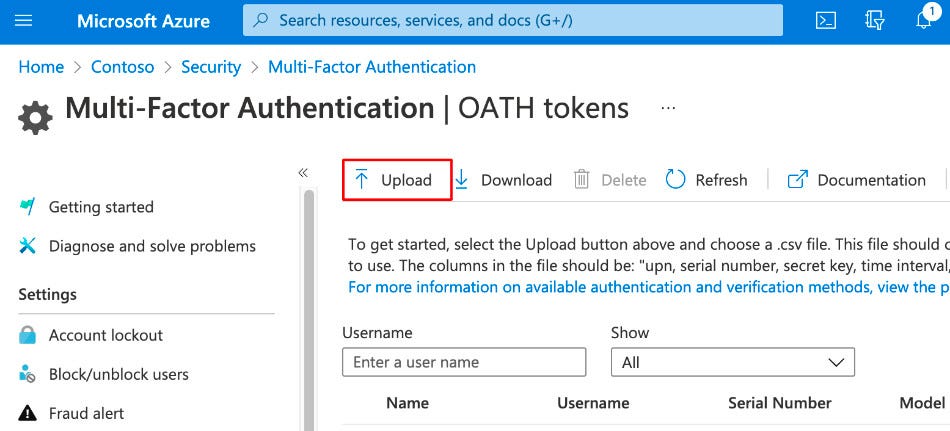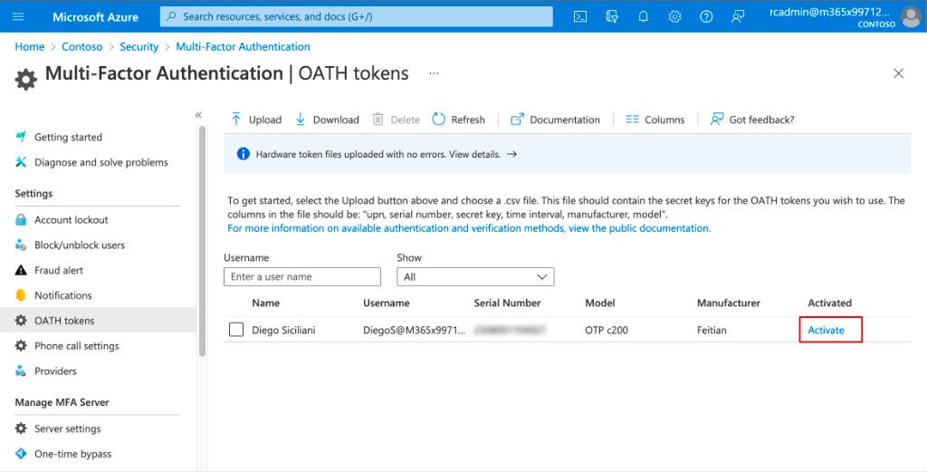 Azure AD –> Security –> MFA –> OATH Tokens