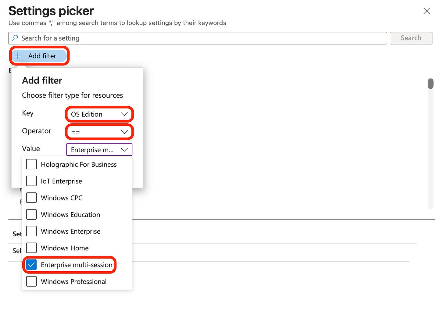 Dopo aver applicato il filtro, i settings disponibili saranno quelli davvero compatibili con AVD multi-sessione.