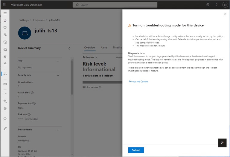 Microsoft Defender for Endpoint Troubleshooting mode