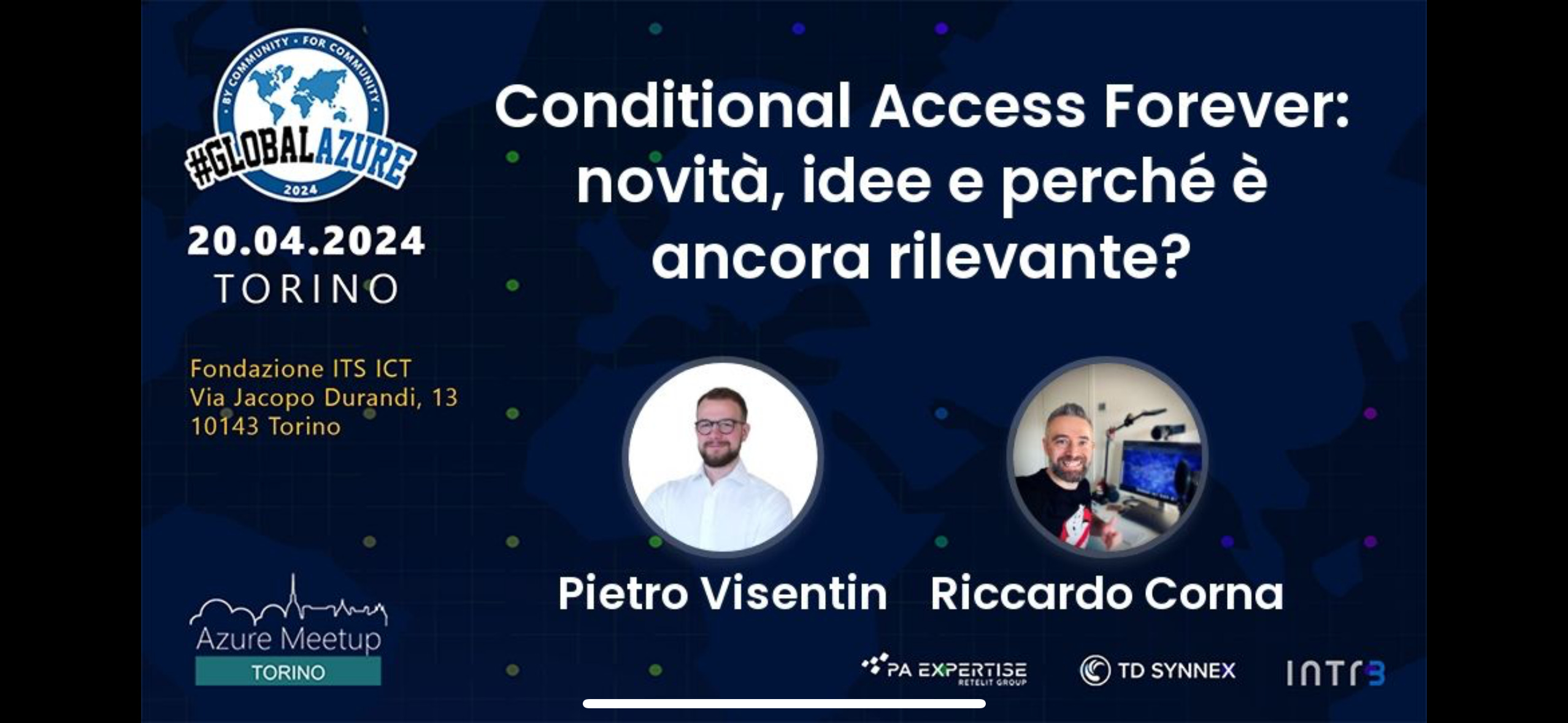 Stagione primaverile degli eventi intensissima! Ci sarò anch’io tra gli speaker del Global Azure di Torino, insieme a Pietro Visentin, per parlare di Conditional Access: novità, best practice, perchè è uno strumento sempre più fondamentale nella strategia di Zero Trust Security.