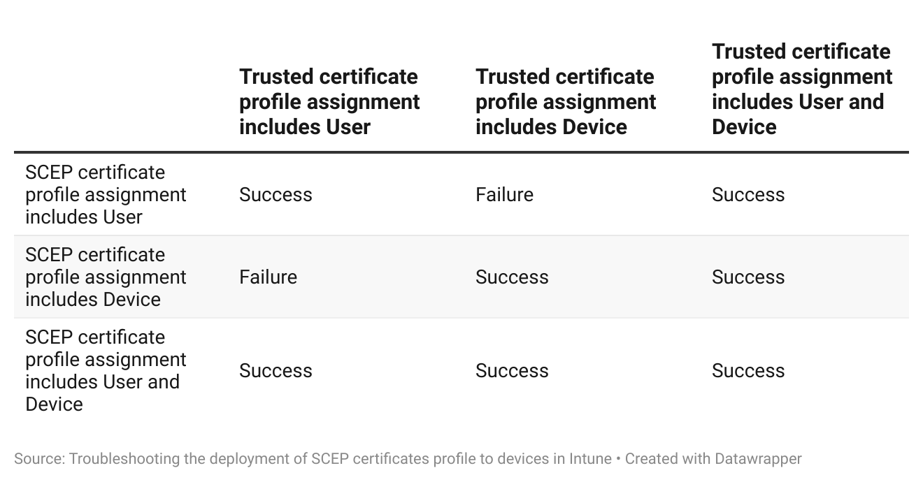 Mantenete coerenza tra le assegnazioni dei profili Trusted Certificate e profili SCEP, assegnandoli allo stesso gruppo e, soprattutto, siate coerenti sulla tipologia di oggetto che popola il gruppo: o utenti o dispositivi. Questo perché c’è una precisa tabella di supportabilità per fare in modo che i certificati vengano effettivamente emessi. Vi riporto la tabella qui di seguito.
