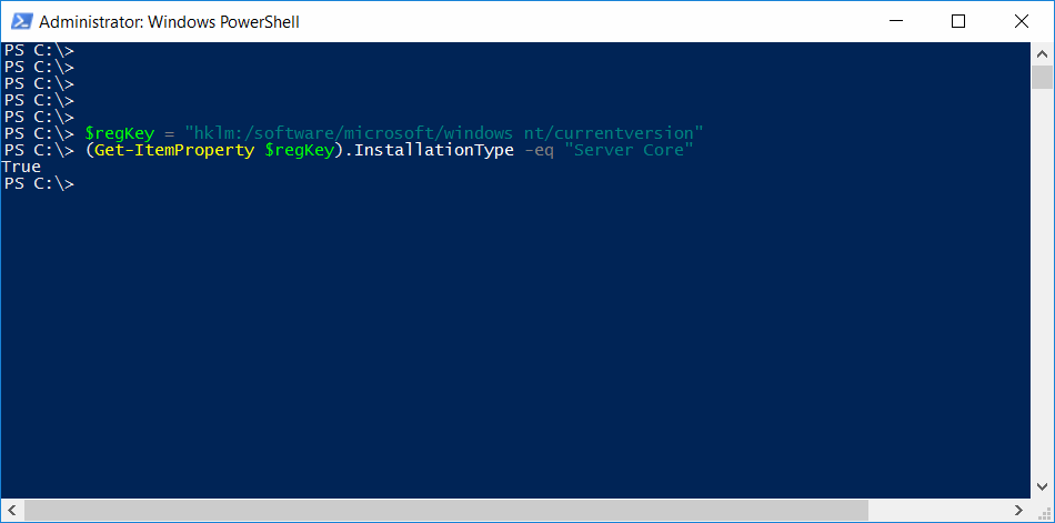 $SrvCore = (Get-ItemProperty $regKey).InstallationType -eq "Server Core"